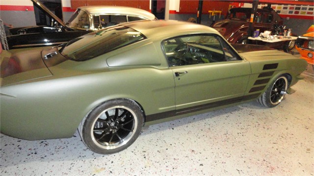 Wiley Saulsbury's 1965 Mustang GT, "Bad Influence" 4.6 Litre with Kenny Bell Supercharger estimated 800 HP, AOD transmission in a full tube chassis. 9" Ford rear and tubular A-arms and rack and pinion front end. Wilwood Disc Brakes. Autometer gauges, Flaming River column, Custom rear spoiler and pan with new taillight panel with 5 flush mounted lights. Brake cooling vents front and rear. Hood stretched 1 1/4" and top of headlight bezel tilted forward to meet hood. Stock hood cut and raised 1 1/2" to accent lines in hood and fenders. Flush mount windshield and back glass.